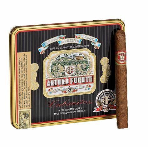 AF CUBANITOS 10/10 TINS 4 1/2X32 (100)” refers to a package containing 10 tins of AF Cubanitos cigars. Each tin holds 10 cigars, and each cigar measures approximately 4 1/2 inches in length with a ring gauge of 32.