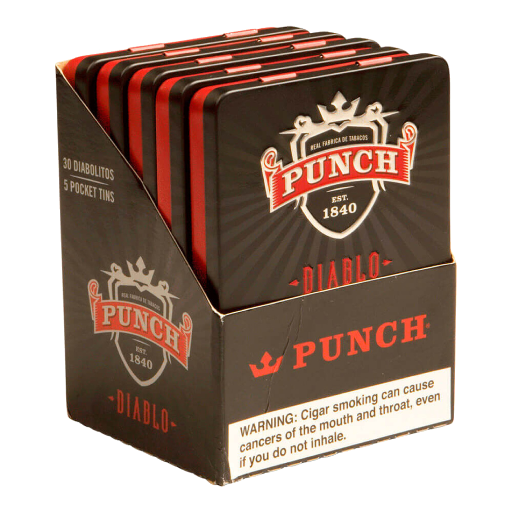 PUNCH DIABLO Diabolitos 4.19 x 365 Tins of 6(30)” refers to a package containing 30 tins of PUNCH DIABLO Diabolitos cigars. Each tin holds 6 cigars, and each cigar measures approximately 4.19 inches in length with a ring gauge of 365.
